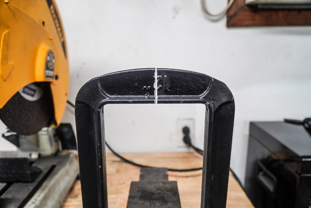 Two issues with the chop saw: there was no safe way to get the subframe directly below the center of the blade for an even cut on both sides, and there was no safe way to clamp the subframe to the saw. Over the years I’ve learned to appreciate proper clamping and not half-ass this step. Strong clamp, clean cut.