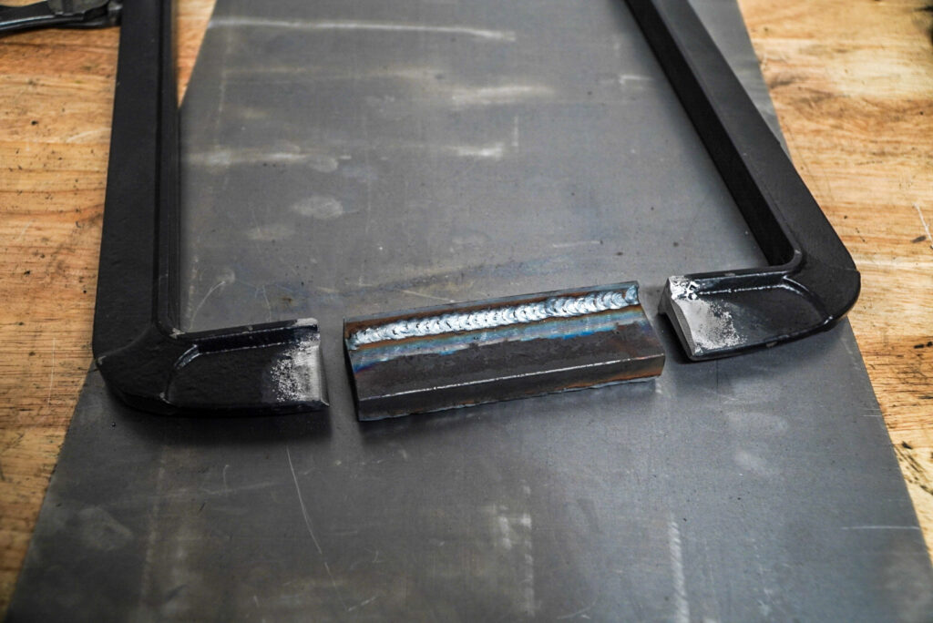 Here’s the piece tacked in and a photo of the jig I mentioned earlier. The bolts are the exact size of the studs on the front subframe hangers. This should ideally match the position of the frame rails on the car within really tight tolerances.