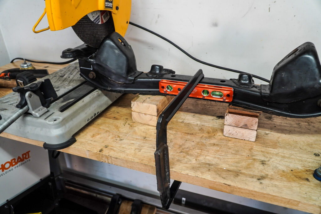 Next, I needed to make the cuts. I had to think about the best way to do this for a bit, so I had a few modelos. The first idea was to put a 12″ angle grinder blade on the 4.5″ grinder, then make a custom holding bracket for the sake of “safety.” Despite not having to be directly near the grinder when executing this absolutely asinine idea, this was still a pretty shitty idea. Then I saw the chop saw sitting in the car after using it to make the front control arms and this was the perfect tool to get an accurate cut.