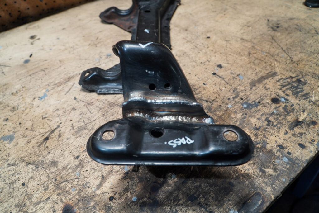 An s-chassis subframe is supposed to have a set of ridges on the bottom for strength. That piece that’s flopping on the left side of the photo is the lower brace for the steering rack. I essentially ground through this thing and I was worried that it would one day fall apart. These subframes are pretty poorly booger welded from the factory in some parts, and are quite thin. If you look closely, they’re really just four large pieces of metal welded together. Two mounds for the motor mount, the lower main piece, and the rack mounts. I don’t even think they’re 1/8″ because the metal I used for this project was thicker. I speculate the rationale was ease of production, and an integrated crush point in the event of a collision to protect the equally fragile frame rails in the engine bay.