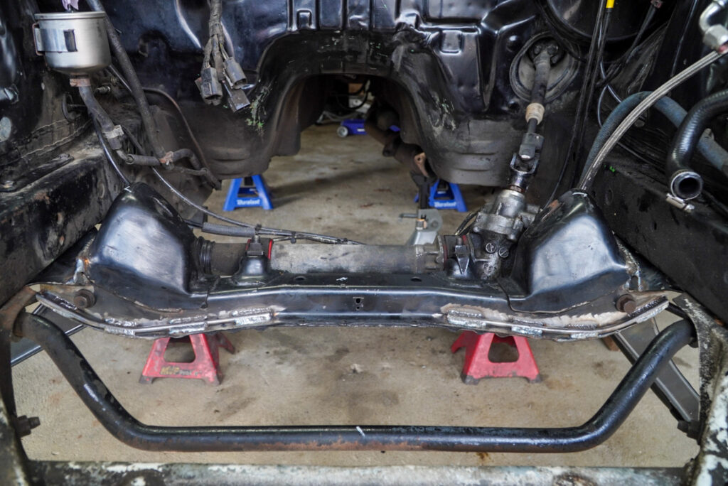 Next, I test fitted the subframe on the car and everything lined up perfectly without binding. The only issue was the newly raised portion of the subframe greatly decreased clearance for the rearmost portion of the front lower control arms. Luckily, these arms have a good bit of unnecessary extra material on the top. Remember what I said earlier about solving problems with angle grinders?